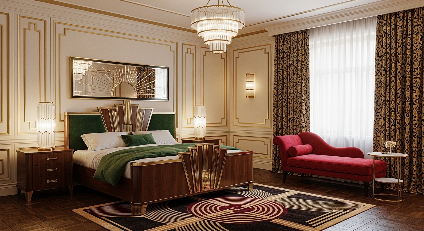 The Art Deco process at Tribuz begins with Geometric Grandeur. We move away from the organic curves of the past and embrace the "Streamline Moderne" aesthetic—sharp zig-zags, sunbursts, and stepped profiles (chevron). The discovery phase focuses on creating a strong Vertical Axis, using tall mirrors and fluted wall treatments to give the illusion of soaring height and monumental scale.