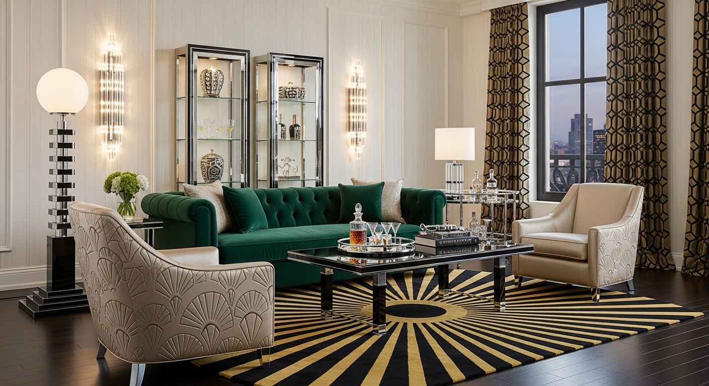 Execution is where we practice High-Contrast Materiality. Art Deco is the ultimate expression of luxury through exotic textures. Our material palette is a curated selection of the rare and the radiant: ebony wood, bird’s-eye maple, mother-of-pearl inlays, and high-shine chrome. We pair these with "Jewel-Toned" velvets in emerald, sapphire, and ruby.