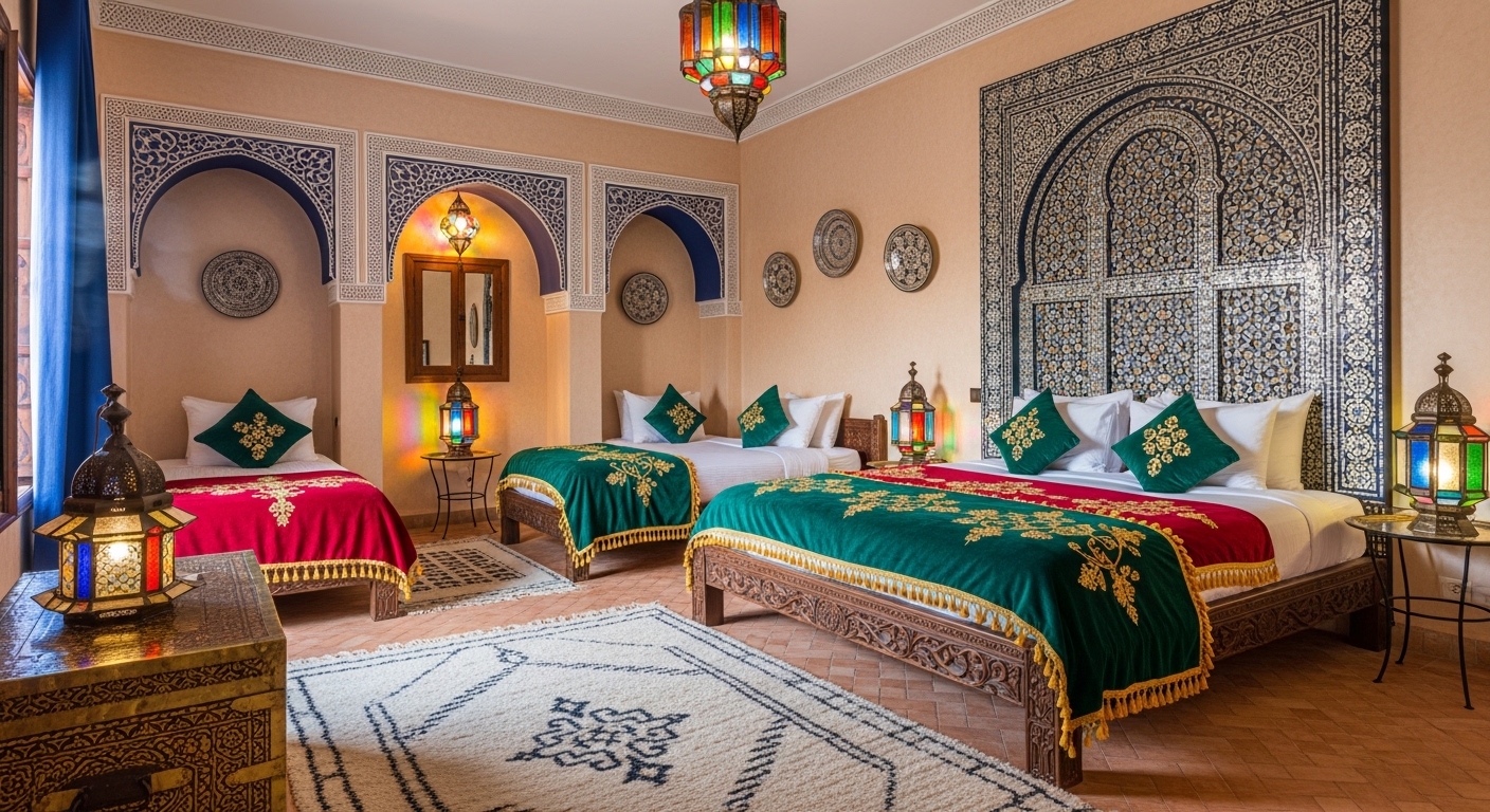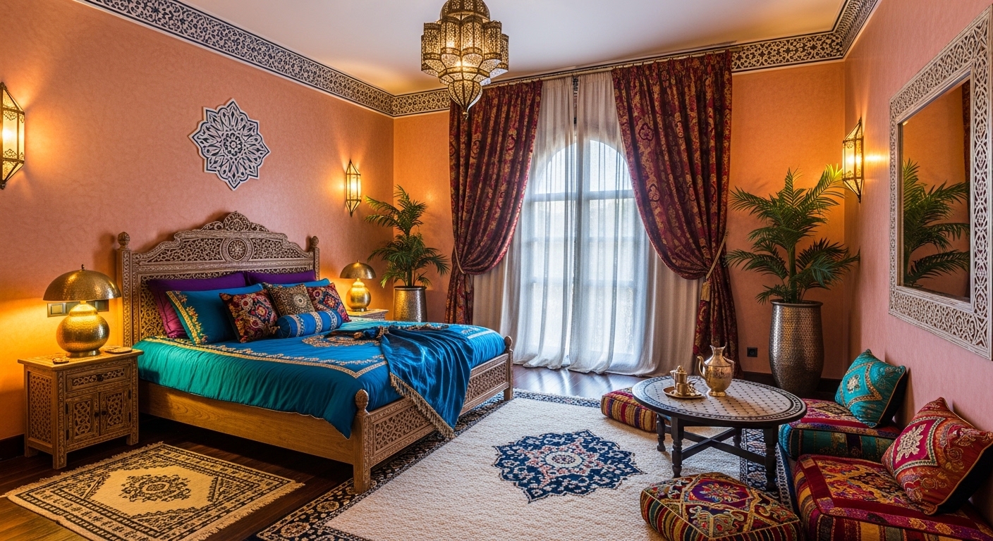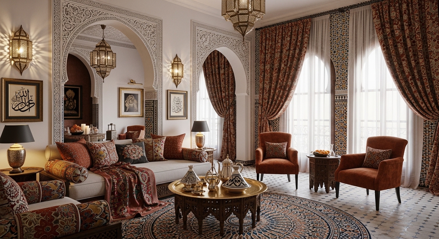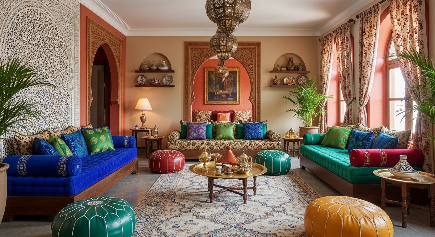 We layer the space with Tactile Maximalism. We pair hammered copper lanterns—which cast "star-map" shadows across the room—with plush, low-seated silk divans and hand-knotted Berber rugs. Every surface is a testament to hand-craft, from the intricate "Muqarnas" (honeycomb vaulting) in the ceiling to the heavy, carved cedar-wood doors. For Tribuz, a Moroccan interior is a celebration of the exotic—a rich, textured narrative that honors the desert’s soul.