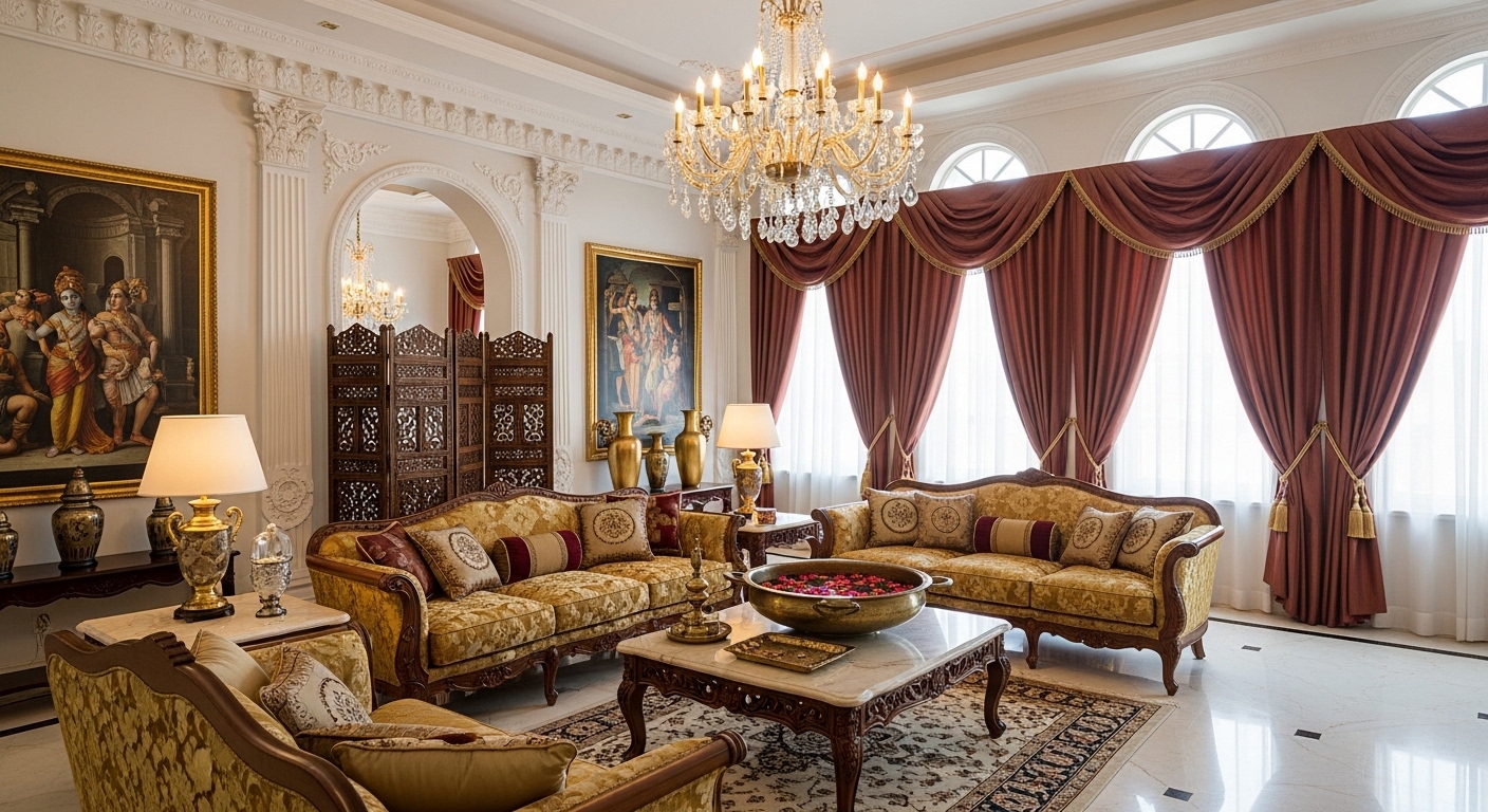 The material palette is a celebration of timeless luxury. We pair statuary marble and polished brass with soft, tactile velvets and silks. Every surface is an interplay of texture—smooth stone against intricate wood carvings. By maintaining a neutral color story—creams, fawns, and muted greys—we ensure that the grandeur of the Neoclassical style feels breathable and perfectly suited for the modern Indian elite.